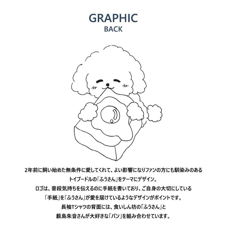 薮島朱音さんとのコラボ企画! 今回のコラボは長袖Tシャツ、ZIPパーカー、スウェットパンツ、キャップをリリース。 【デザイン】 2年前に飼い始めた無条件に愛してくれて、よい影響になり ファンの方にも馴染みのあるトイプードルの「ふうさん」をテーマにデザイン。 ロゴは、普段気持ちを伝えるのに手紙を書いており、 ご自身の大切にしている「手紙」を「ふうさん」が 愛を届けているようなデザインがポイントです。 長袖Tシャツの背面には、食いしん坊の「ふうさん」と 薮島朱音さんが大好きな「パン」を組み合わせています。 ここでしか手に入らない受注期間限定アイテムです!是非お買い求めください!!! ※商品の発送予定時期は 【5月中旬頃~5月下旬頃順次発送】 となります。 ※受注生産の為、生産状況により発送予定時期は変動する場合がございます。 ※高額注文の場合にはご注文後にお電話にてご連絡をさせていただく場合がございます。 お電話にてご連絡が取れない場合にはメールにてご連絡させていただき、 ご連絡日より3日以内にご返信をいただけない場合には不正注文の可能性があると判断し トラブル防止のためご注文をキャンセルとさせていただきます。 ※商品によっては撮影時にサンプルを使用しているため若干仕様が異なる場合がございます。 また、サイズ・カラーによっては仕様が異なる場合もございます。 ※手作業で縫製をしているため縫製の仕様により、 個体差が生じてしまいますので、1~2cm程度の誤差は予めご了承くださいませ。 ※洗濯機を使用した場合、お届け時のサイズより多少縮む場合がございます。 洗濯機を使用する場合は裏返してネットに入れることを推奨しております。 また、タンブラー乾燥機を使用しますとプリントが剥がれる恐れがありますので 避けていただきますようお願いいたします。 また、洗濯時の液温は40度以下とし、 塩素系および酸素系漂白剤の使用は避けていただきますようお願いいたします。 アイロンにつきましてもプリント及び刺繍部分は避け、 生地部分にアイロンをかける場合にはあて布をして110度(低温)にてお願いいたします。 ※また、受注生産とさせていただいておりますが、 各色・サイズ毎に生産数に限りがございます為、 生産数の上限に達しました場合在庫切れとなる場合がございます。 |